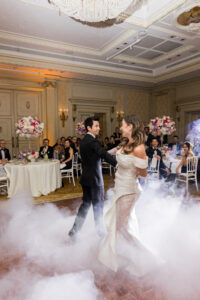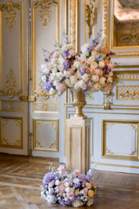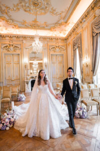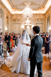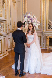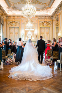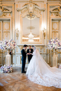 The ceremony took place in the legendary Grand Salon of the Shangri la Paris, exquisitely transformed by the creative vision of Hibiscus Events. Soft floral arrangements, harmonious color palettes, and subtle lighting elevated the already magnificent space into a dreamlike sanctuary of love. This setting alone would have been enough to define a Paris luxury wedding, yet what unfolded within it made the moment truly unforgettable.