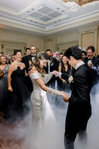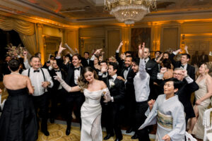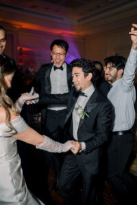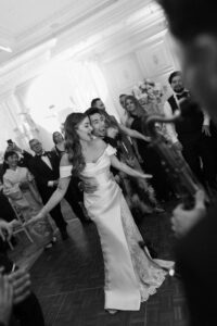 The evening continued in the beautifully decorated Salon Bonaparte, transformed into a floral wonderland for dinner and dancing. Candlelight flickered across tables, laughter echoed through the room, and the atmosphere buzzed with anticipation for the festivities to come. When the music began and the first dances unfolded, I felt deeply moved behind my lens. As a Paris wedding photographer, capturing those first dance steps, the spontaneous embraces, and the fiery energy of the dance floor is always a highlight. These are the moments when elegance gives way to pure joy, and when a Paris luxury wedding reveals its most human, heartfelt side.