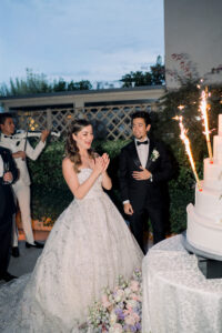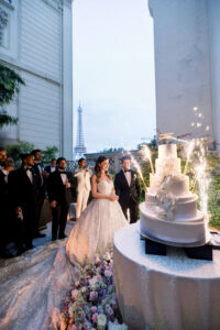Here, against the iconic backdrop of the Eiffel Tower, Elona and Jérôme cut their wedding cake. Illuminated by twinkling lights and the golden glow of sunset, the cake shimmered almost as brilliantly as Elona’s gown. It was a moment of pure joy and visual poetry—one that perfectly encapsulated the spirit of their Paris luxury wedding. As a Paris wedding photographer, I couldn’t have asked for a more cinematic scene: laughter, champagne flutes raised in celebration, and the Eiffel Tower standing as a timeless witness to their love.