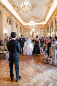 The Grand Salon located at the second floor, is definitely the most splendid place in the whole palace. Its guilded moldings offer an absolutely unique setting in Paris to celebrate your wedding in an extremely luxurious venue. However, as a Paris wedding photographer, I recommend holding the ceremony as early as possible in the afternoon. As evening approaches, the golden reflections of the salon become stronger, and artificial lighting casts a lot of yellow tones on faces, which can be difficult to correct in post-production.