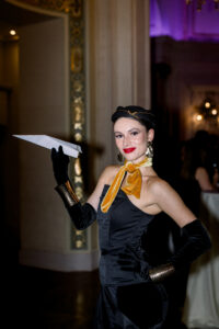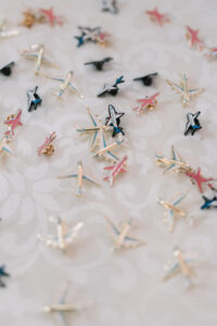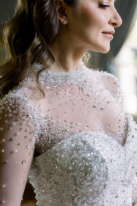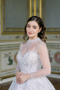 Amid all the imaginative details celebrating travel, there were also moments of pure, timeless beauty—and none more striking than Elona’s extraordinary wedding gown by Liza Ray New York. This couture masterpiece was nothing short of a work of art. With an immense train and thousands of tiny rhinestones meticulously hand-sewn onto the fabric, the dress shimmered softly with every movement, catching the light of the Grand Salon in the most enchanting way. Designed to be worn in multiple styles, it could be paired with a pearl-embroidered bodysuit for a more fashion-forward look or worn as a strapless gown for a classic, romantic silhouette.