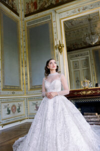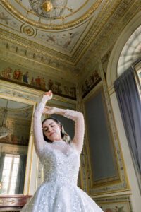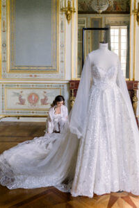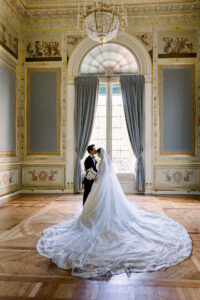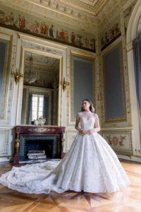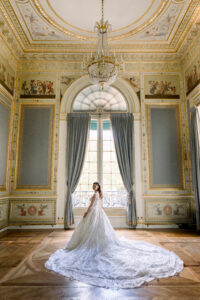 The Salon de Famille is a room adjoining the Grand Salon, and its wall paintings and chandelier are incredibly delicate. I highly recommend organizing your first look there, as the setting is exceptionally elegant. Group photos can also be taken in this room, as the natural light is very flattering.