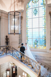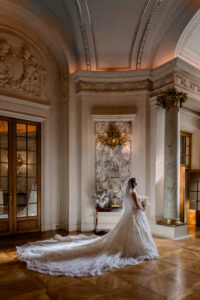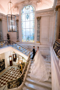 What makes the Shangri la Paris particularly enchanting is its versatility. You can envision a wedding here that is classically romantic and timeless, or one that is bold, modern, and avant-garde—and both would feel perfectly at home within its walls. The crown jewel of the venue is undoubtedly the Grand Salon, with its dazzling gilded moldings, soaring ceilings, and luminous chandeliers. This spectacular space offers an awe-inspiring backdrop for a ceremony or a candlelit dinner, embodying everything one could desire from a Paris luxury wedding venue. Beyond its interiors, the location itself is a dream: just steps away from the Eiffel Tower, with several rooms and terraces offering breathtaking, postcard-worthy views of this global icon. As a Paris wedding photographer, capturing a couple framed by the Eiffel Tower from the Shangri la Paris is nothing short of magical—and it sets the tone for an unforgettable Paris wedding experience.