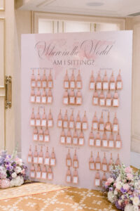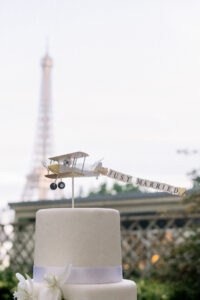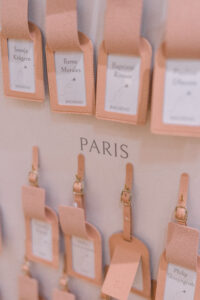 Every detail of their wedding design paid homage to this theme. Guests were welcomed with charming luggage-tag place cards on the seating chart, instantly evoking the excitement of departure lounges and faraway destinations. Delicate airplane-shaped pins were scattered as whimsical accents, while a full-sized vintage trolley proudly displayed the name of their imaginary airline, “Jelona”—a playful fusion of their names that brought smiles to every face. Even the hosts who greeted guests were dressed in chic flight-attendant-inspired uniforms, turning the arrival experience into a cinematic moment. As a Paris wedding photographer, I delighted in capturing these inventive touches, knowing they would become cherished visual memories of a truly personal Paris wedding.